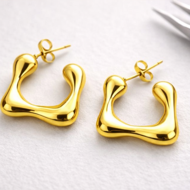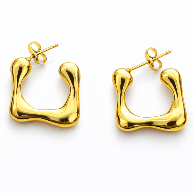 These molten-style gold hoop earrings feature a fluid, sculpted form with a high-shine finish. Designed to feel bold yet wearable, they add a modern, artistic edge to everyday styling a standout piece from Rush The Label.