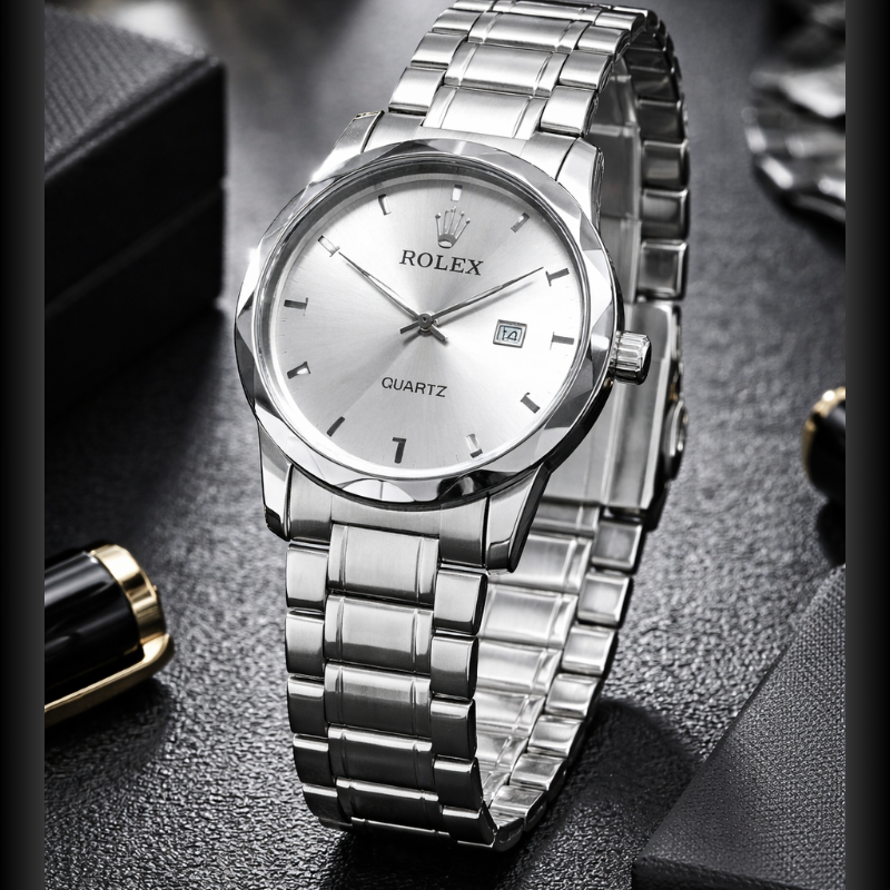 Crafted with a premium stainless steel body and strap, the watch showcases a sleek silver finish that exudes luxury and confidence. The polished metal surface reflects light beautifully, giving the watch a refined and premium appearance. Its sturdy construction ensures long-lasting performance, making it a reliable companion for daily wear.
