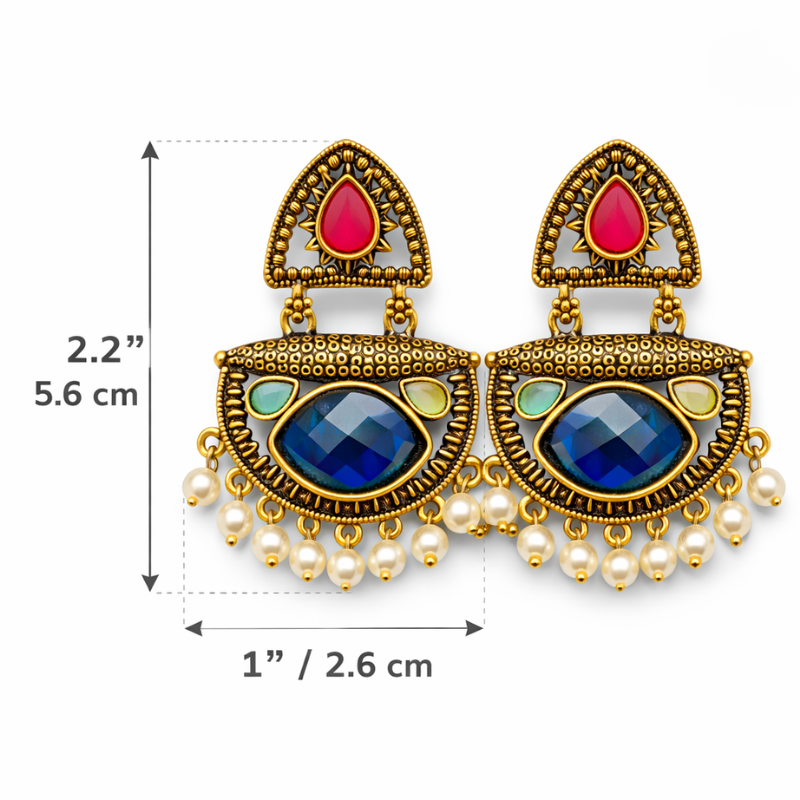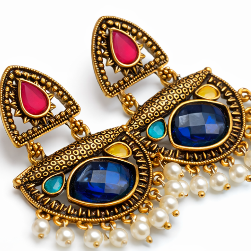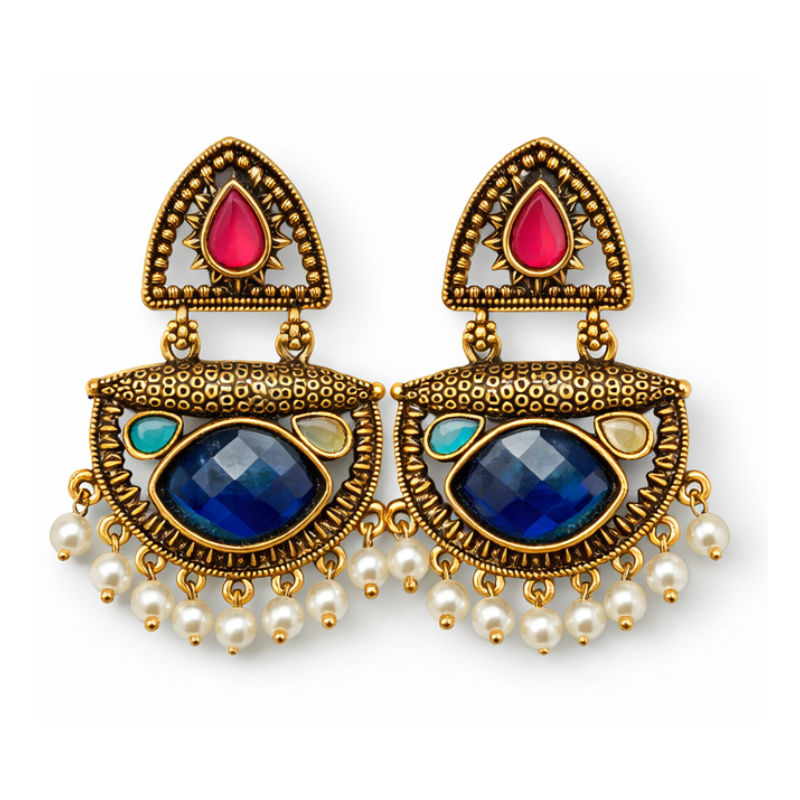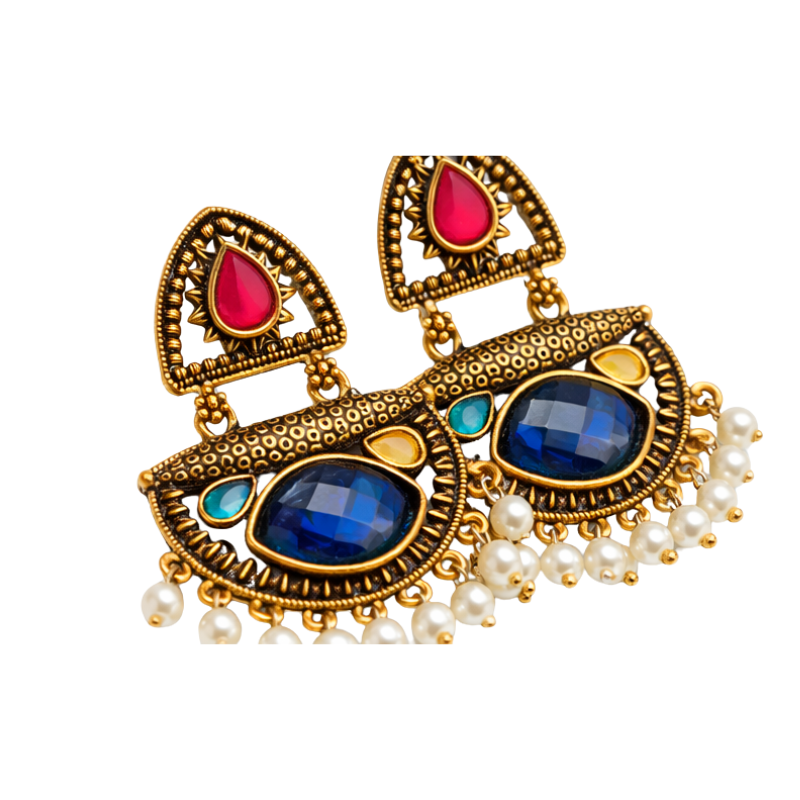 Perfect for weddings, festivals, and traditional celebrations, these earrings beautifully complement sarees, lehengas, anarkalis, and ethnic suits. The rich stone colours add a striking contrast, while the delicate pearl drops enhance movement and sophistication. Lightweight yet statement-worthy, they offer both comfort and grandeur.