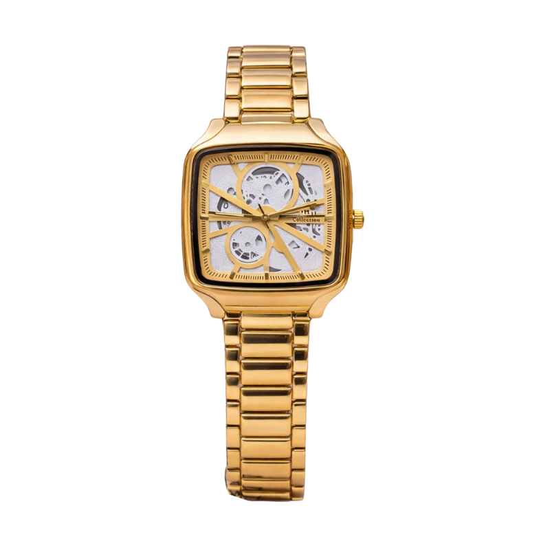 Upgrade your style with this Rush the Label Luxury Square Skeleton Gold Chain Watch for Men. Designed with a premium gold-plated square dial and a stunning skeleton design, this watch gives a rich and classy look. The transparent dial shows the inner mechanical-style detailing, making it a perfect statement piece for fashion lovers.