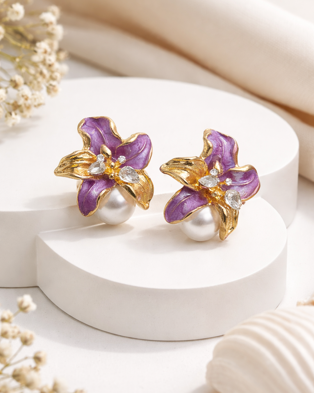 Rush The Label Women Purple Enamel Floral Stud Earrings with Pearl