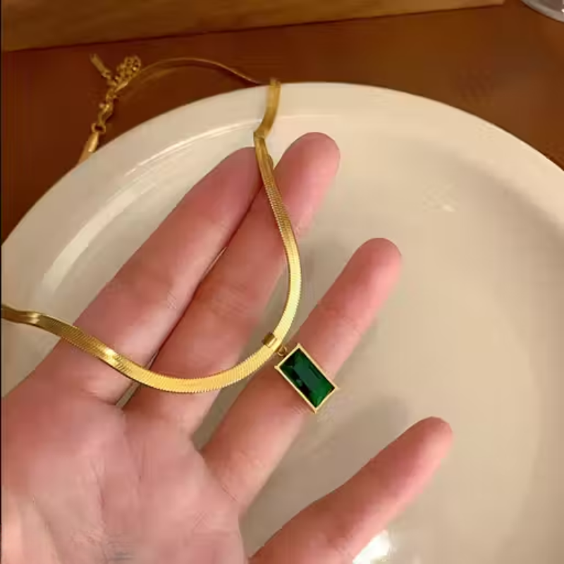 Add a touch of royal charm to your jewellery collection with the Rush The Label Gold Plated Green Stone Pendant Necklace. Designed with a rich green stone set in a radiant gold-plated frame, this necklace brings elegance, colour, and sophistication to every look.