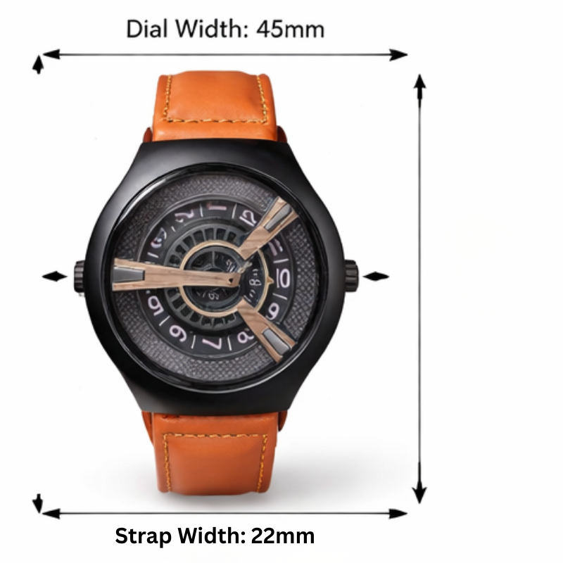 Housed in a matte black case and paired with a premium brown leather strap, this watch perfectly blends rugged masculinity with vintage elegance. The bold hands and layered dial design ensure easy readability while adding depth and character to your wrist.