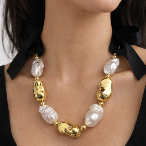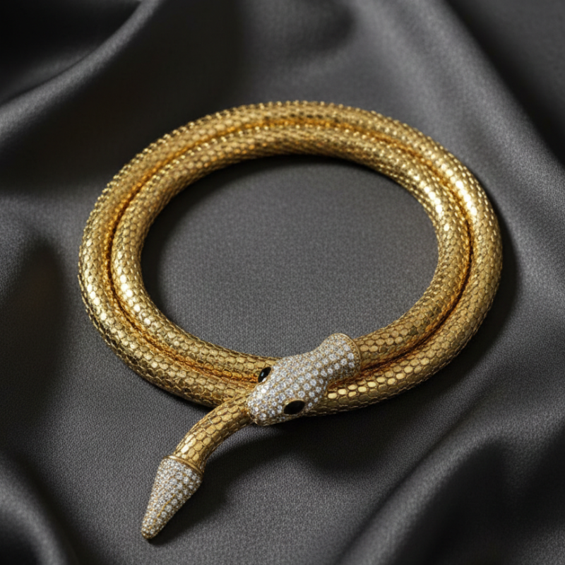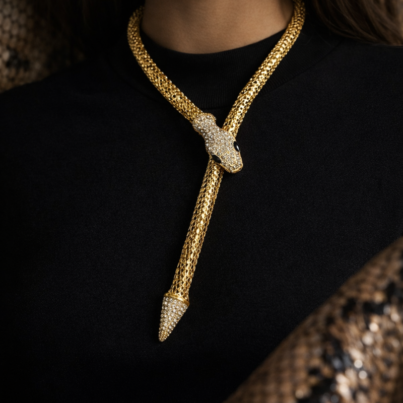 This snake-inspired gold necklace features a fluid, textured chain accented with diamond-studded details for a bold yet elegant finish. Designed to make a statement, it effortlessly blends power, luxury, and modern glamour a standout piece from Rush The Label.