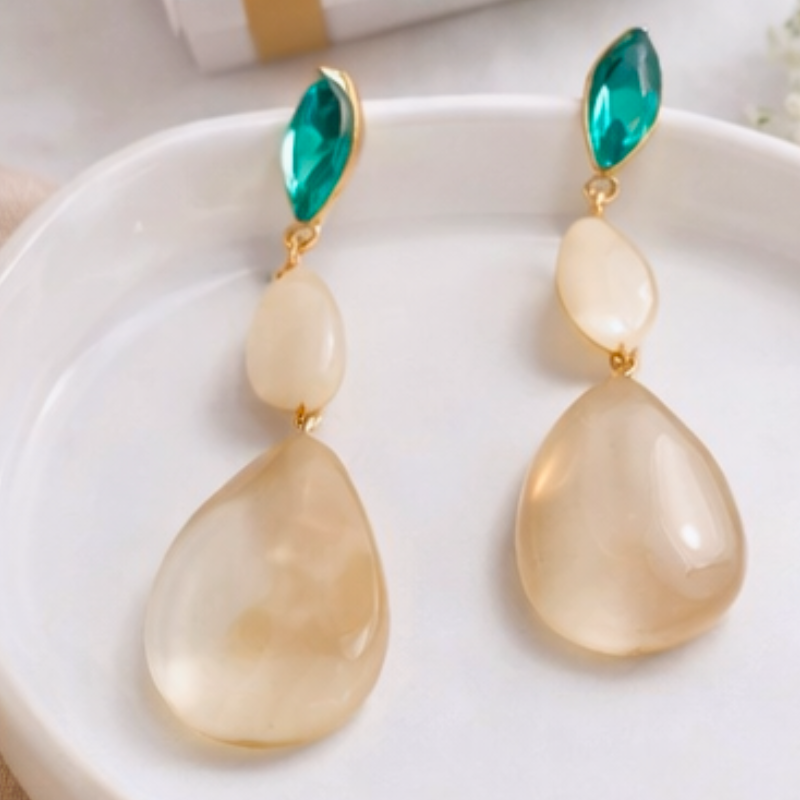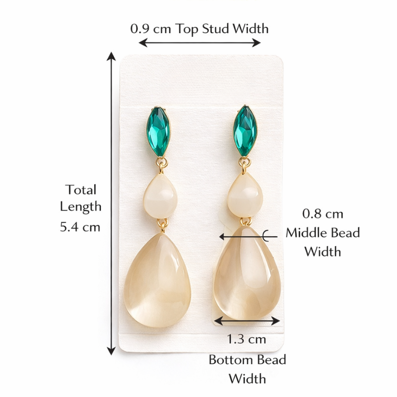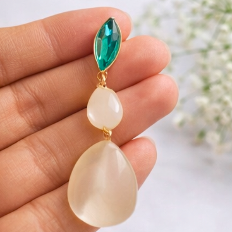 The highlight of these earrings is the stunning contrast between the rich green stone and the soft beige stone, creating a harmonious and eye-catching design. The stones are carefully set to enhance their shine and color, giving the earrings a refined and premium appearance. The elegant drop style adds length and drama, making them perfect for women who love statement jewellery.